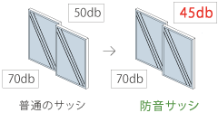 | ���ޖʂƃR���N���[�g�X���u�i��150�`200mm�j�ʂ̊ԂɊɏՃ]�[����݂�����d���\�����̗p�B�Չ����ɂ��z�����܂����B | �f�M���\���������w�K���X���̗p�B�O���̔M���C�������ɓ`���ɂ����悤�ɒf�M�������߂Ă��܂��B | �T�b�V�́A�h�����\�̗D�ꂽ�Չ�����T-1�̃G�A�^�C�g�T�b�V���̗p�B�O���̑�����70db�i�吺�ł̉�b���ʗʂ̑������H�Ȃǁj�ł���A45db�܂ŗ}�����A�Â����Ɨ�����������炵�����܂��B |